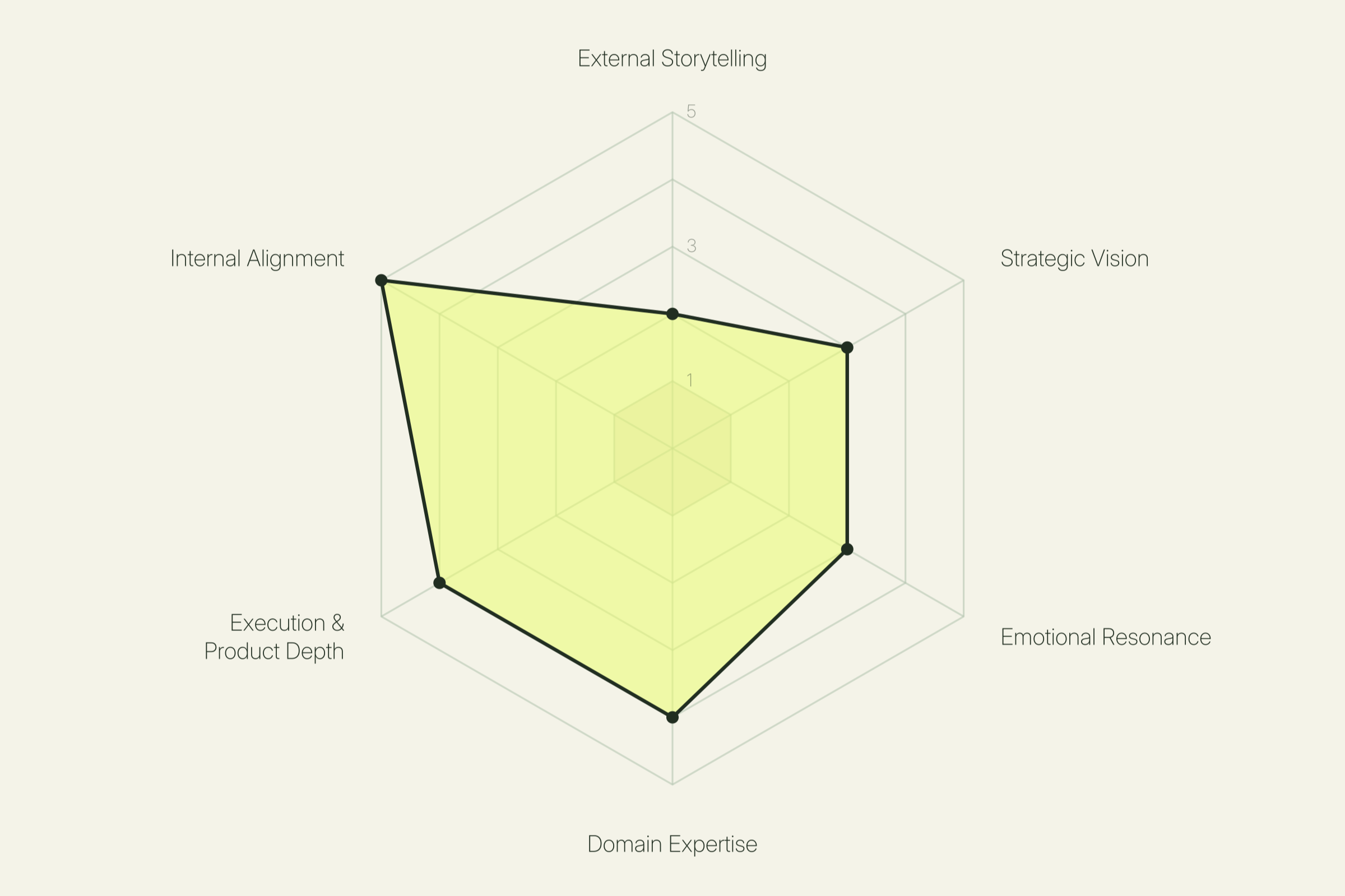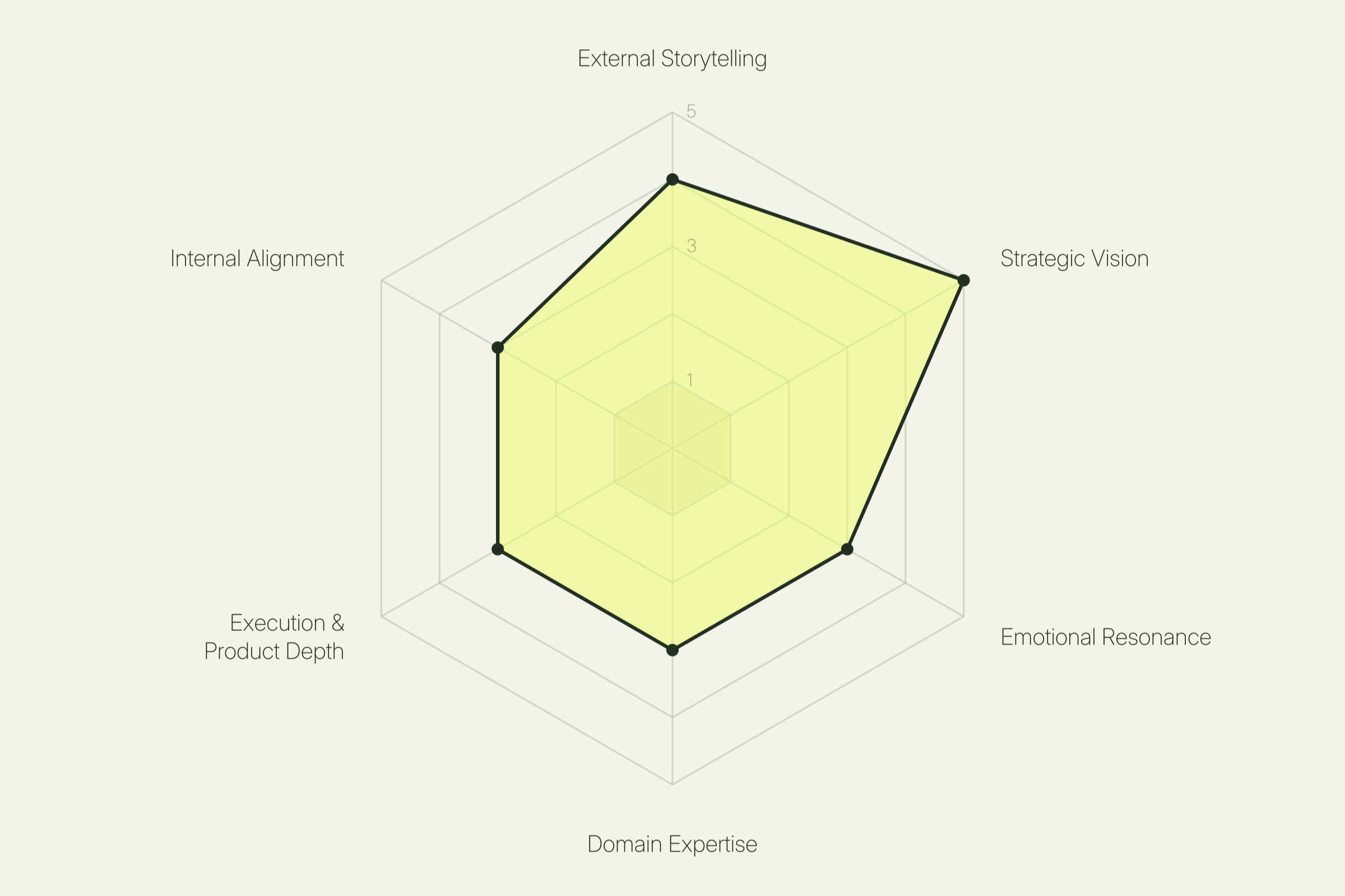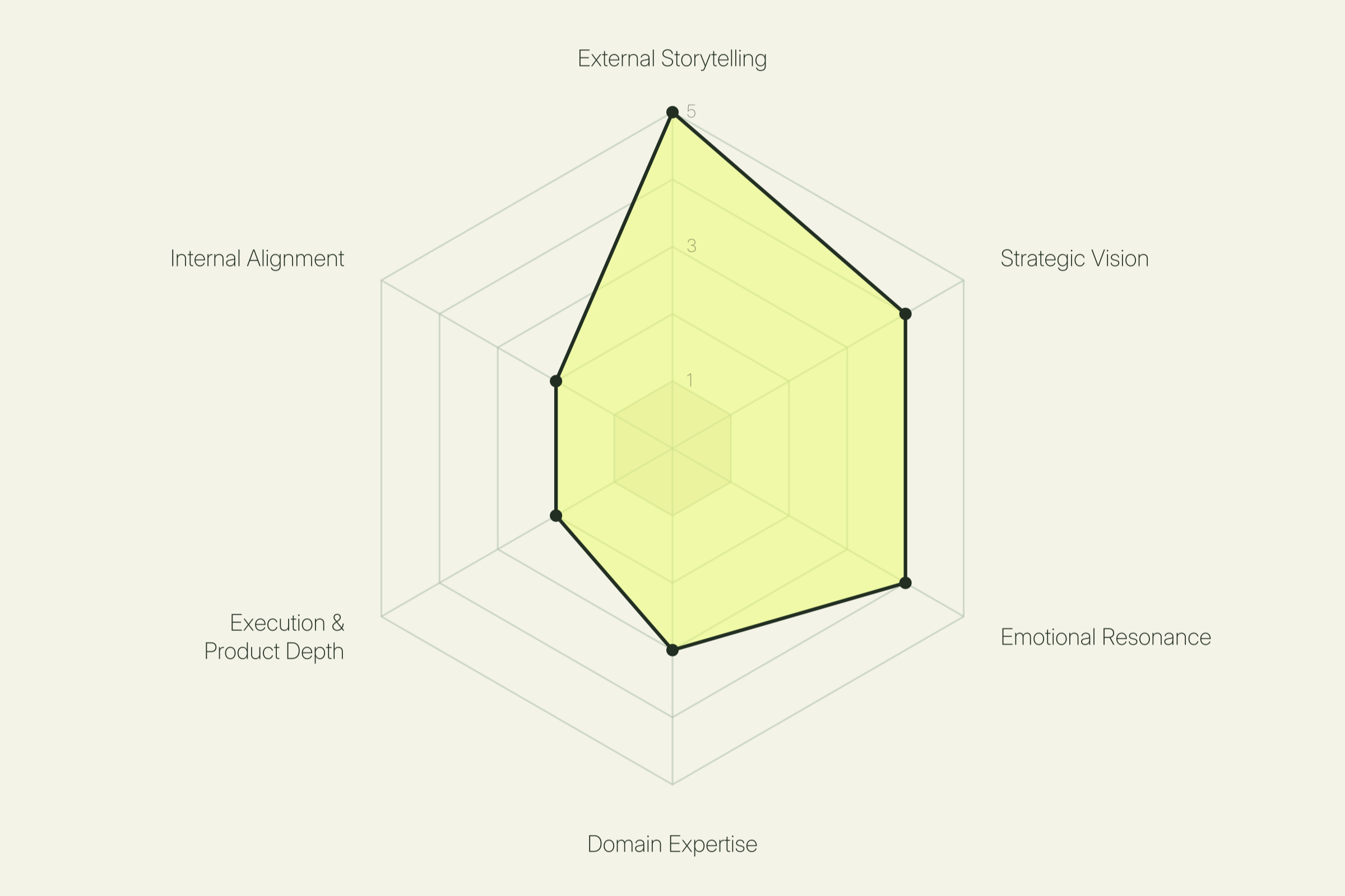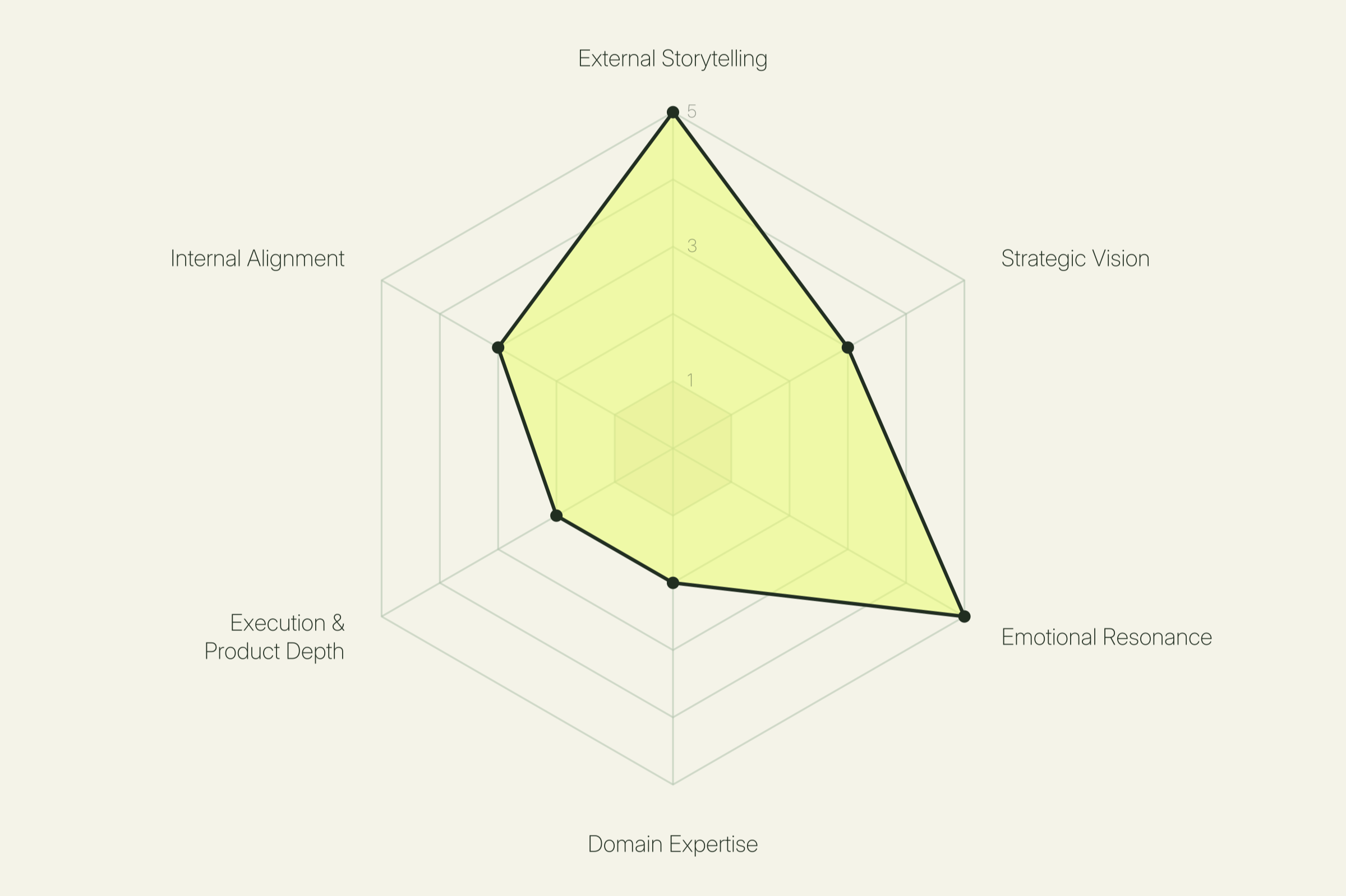 How a leader communicates outward, to audiences beyond the company. This is the ability to craft a story that lands with investors, press, customers, partners, and the public. It covers pitch and platform skills, narrative instinct, and the discipline to adapt the same core message for different rooms. Leaders strong on this dimension know how to unlock attention, capital, and momentum through what they say in public moments. Leaders lower on this dimension tend to let the work or the data do the talking, which often means opportunities to build a wider reputation are missed.